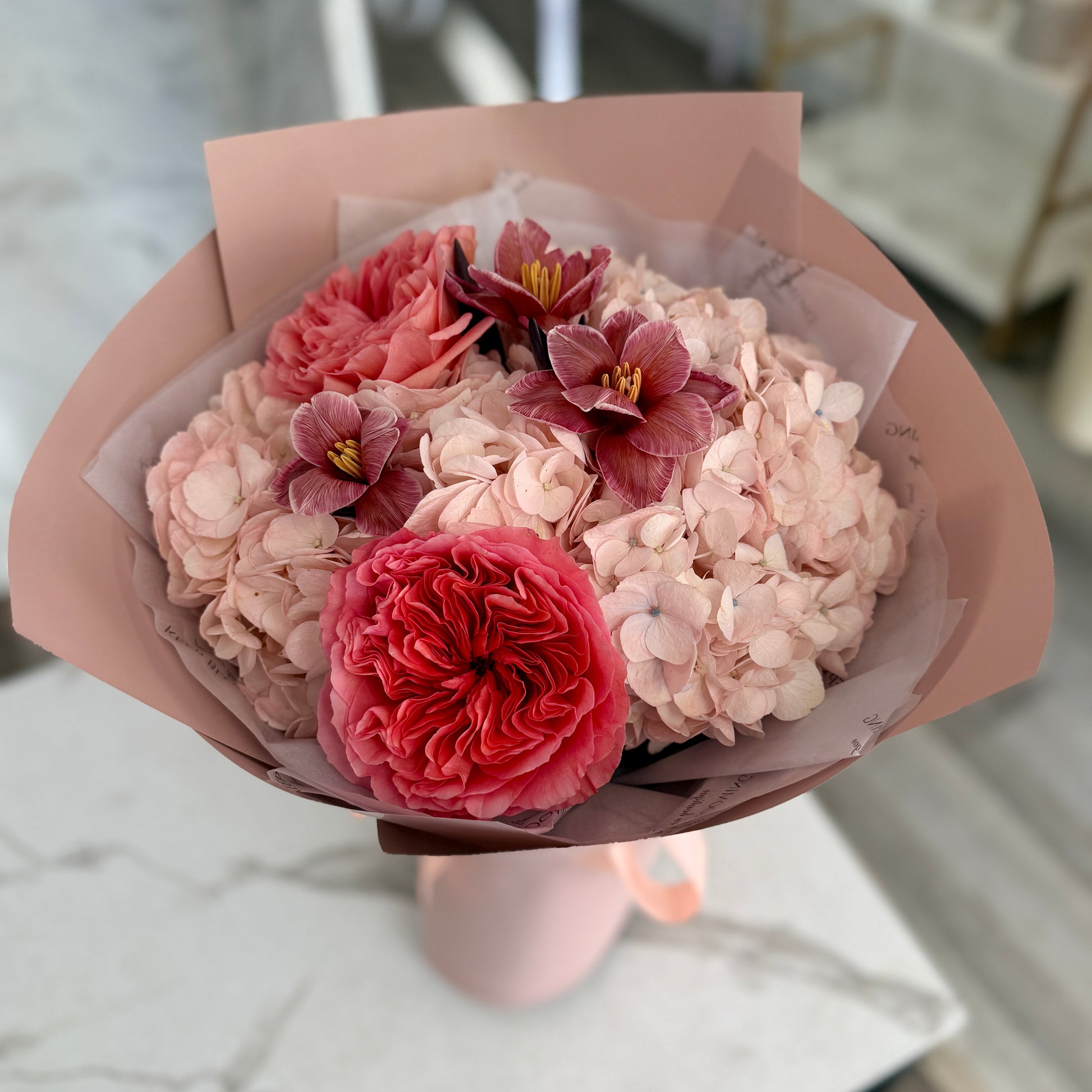 A delicate mix of pink garden roses, hydrangeas, and tulips designed to capture pure softness and romance. Full, airy, and feminine — the kind of bouquet that makes every moment feel special. Perfect for birthdays, anniversaries, or simply to say “you deserve something beautiful.”