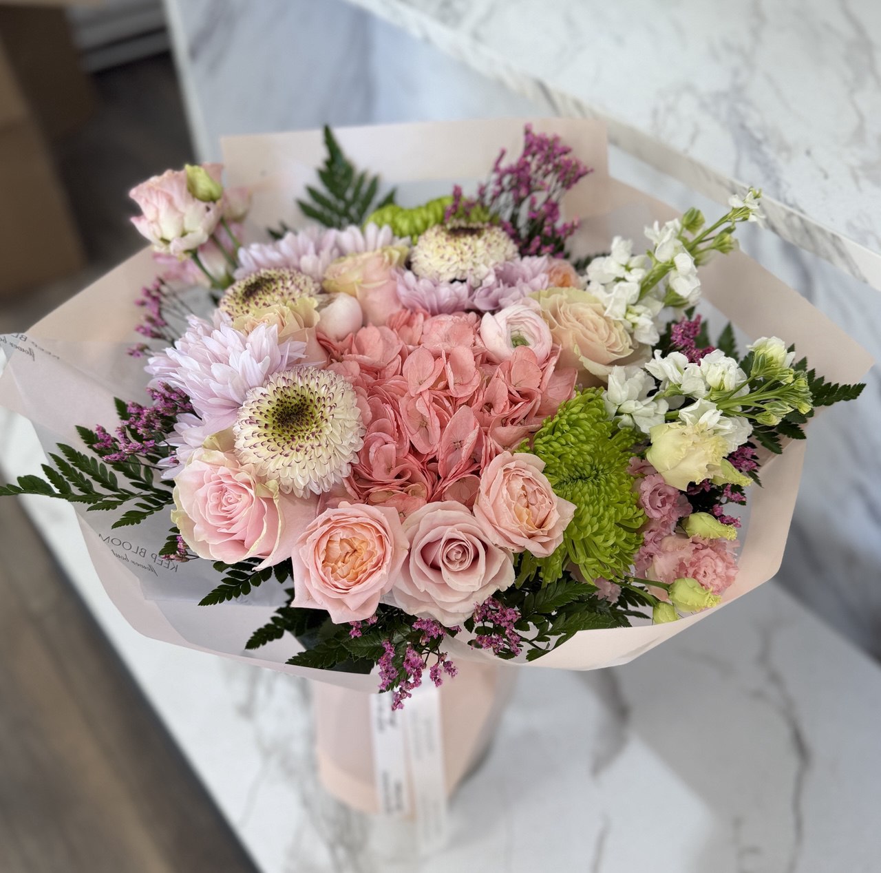 Soft pink tones and lush textures come together in this romantic bouquet of hydrangea, roses, mums, stock, and fresh greenery. Full, elegant, and sweetly fragrant — Blushing Garden is perfect for celebrating love, birthdays, or simply brightening someone’s day.