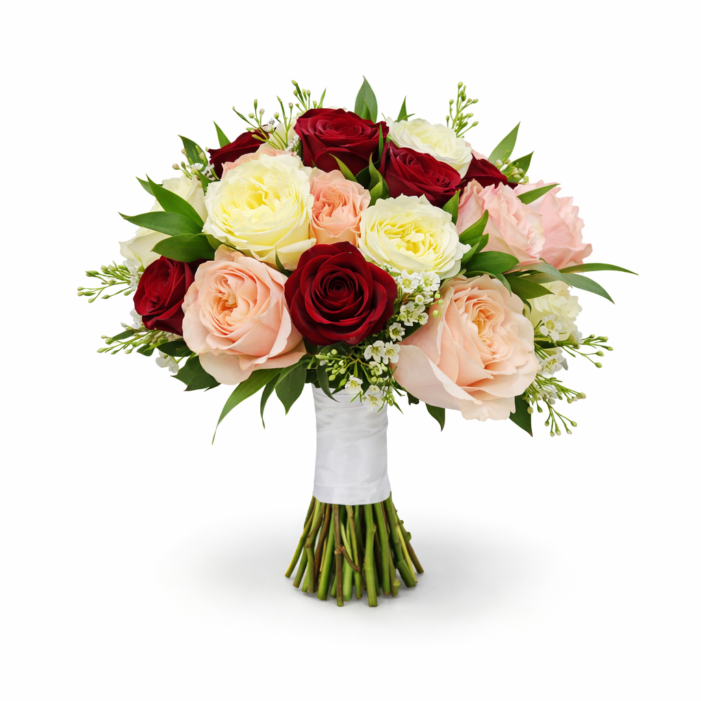 Blushing Romance is a timeless wedding bouquet that beautifully blends passion and softness in one elegant design. Featuring rich red roses, delicate peach roses, and classic white roses, this arrangement creates a harmonious balance of romance and sophistication. Fresh seasonal greenery adds natural movement and texture, completing the bouquet with an airy, refined finish.