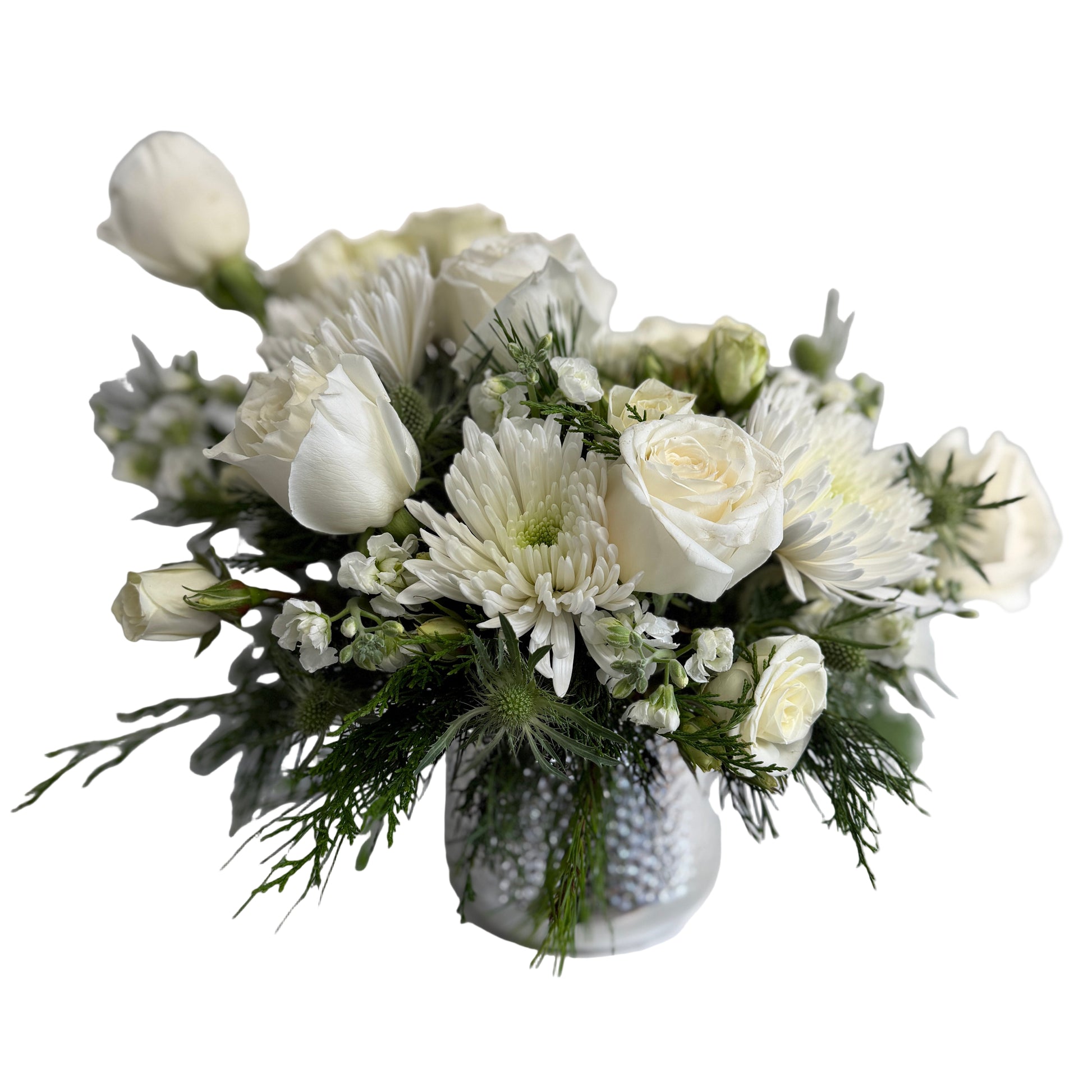 A timeless white and green arrangement that speaks of calm and sophistication. Featuring elegant white roses, soft ranunculus, and lush greenery in a modern pot — perfect for any space that calls for quiet beauty and refined charm.