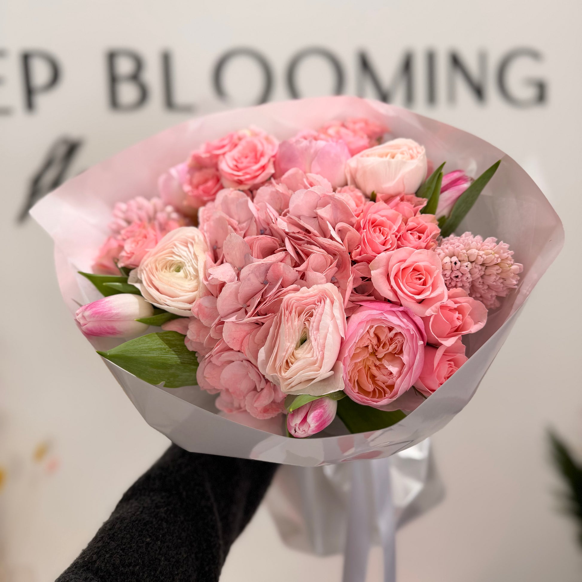 A soft and romantic bouquet in delicate blush tones, featuring lush hydrangea, garden roses, ranunculus, spray roses, and fresh tulips. Designed with layered textures and elegant pastel shades, this arrangement captures the beauty of a blooming spring garden and makes a timeless gift for any special occasion.