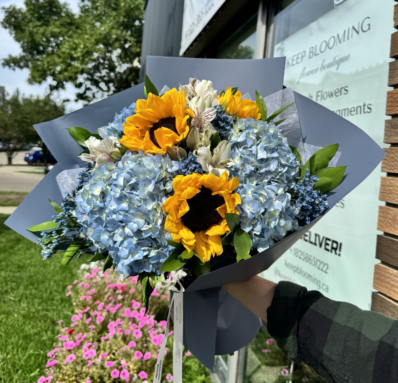 Bright sunflowers and soft blue hydrangeas come together in a cheerful mix that feels like sunshine under a clear sky. Sunshine Sky brings happiness, hope, and positivity — a perfect gift to lift someone’s day or celebrate joyful moments.