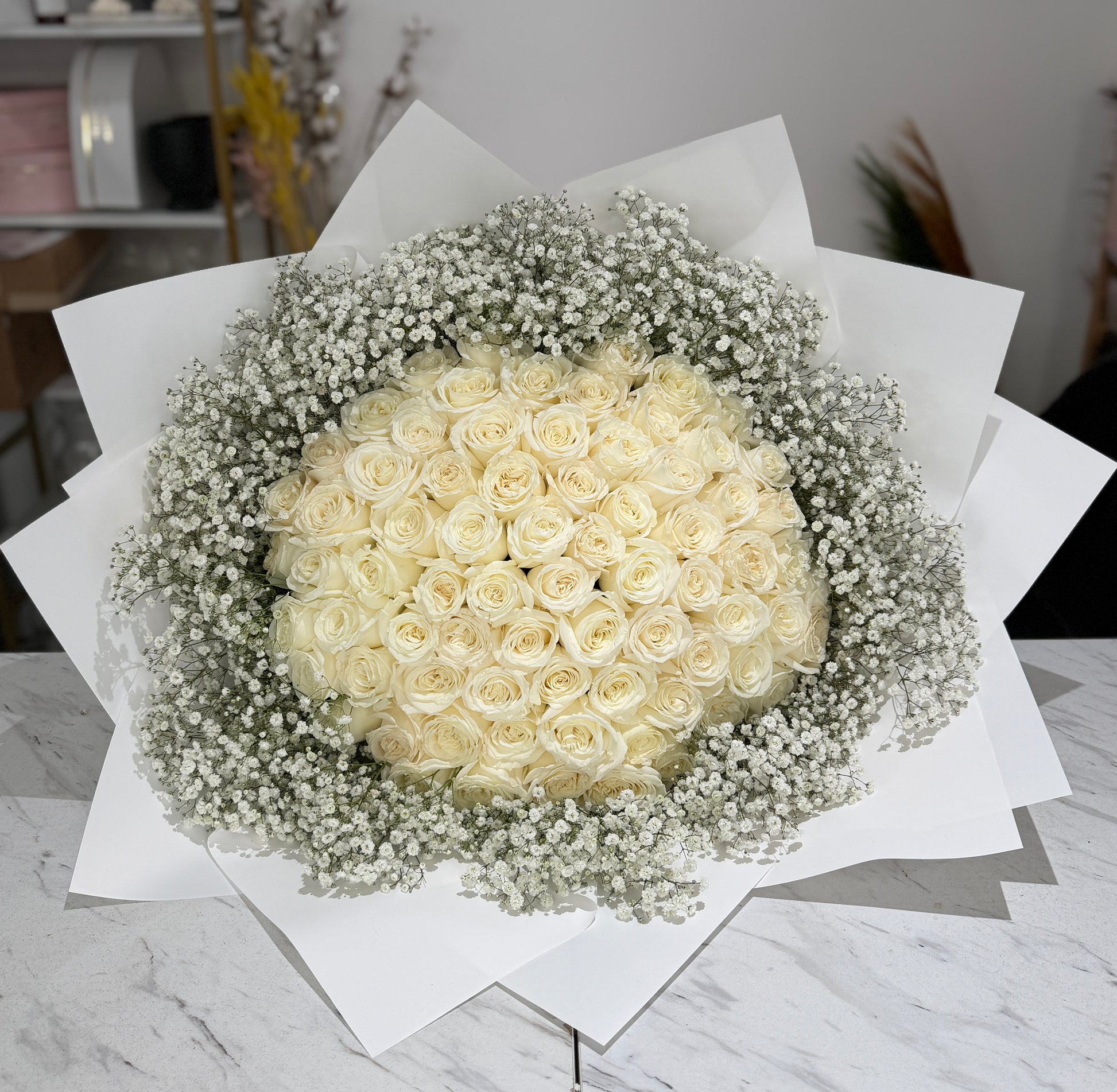 Forever Yours is a timeless and elegant bouquet featuring 75 premium white rose stems delicately accented with soft baby’s breath. Symbolizing purity, devotion, and everlasting love, this full and luxurious arrangement makes a powerful statement without saying a word. Graceful and refined, it’s a perfect choice for Valentine’s Day, anniversaries, weddings, or life’s most meaningful moments.